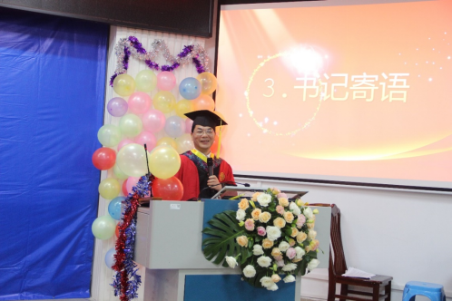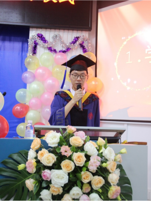 学院研究生办公室秘书胡亮青老师主持并介绍出席典礼的领导、嘉宾和老师。紧接着,毕业生学生代表董奕发言,他代表毕业生衷心感谢学校和学院的关心和培养、感谢老师的指导与帮助。