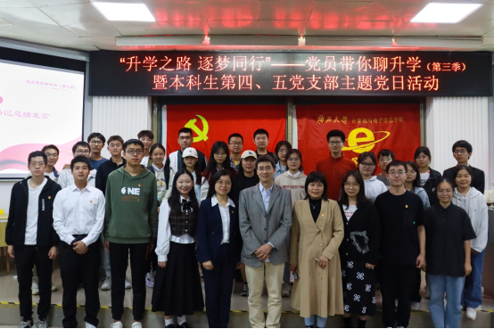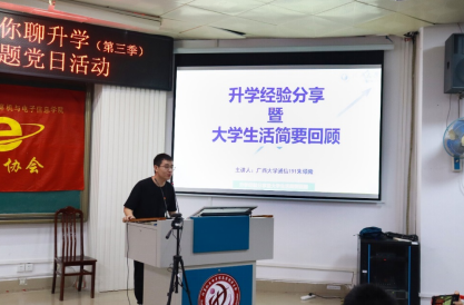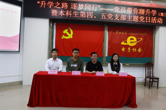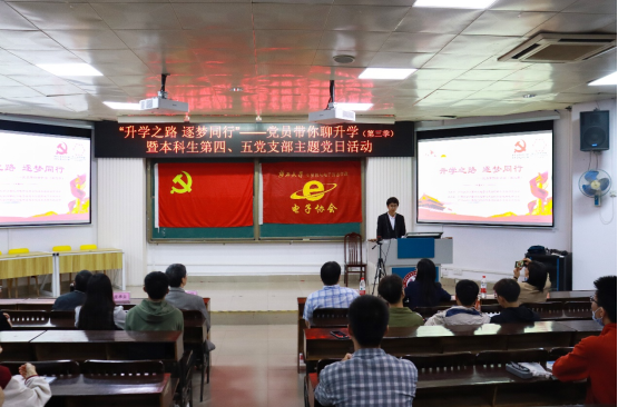 2022年11月26日晚上,由jdb电子游戏官方网站本科生第四党支部主办,联合本科生第五党支部、学院团委电子创新协会共同承办的主题为“升学之路 逐梦同行”——党员带你聊升学(第三季)升学经验分享会在学院214报告厅举行。学院党委副书记邓珍琪老师,学院学生电子创新协会指导老师、电子信息工程系主任张学军教授,本科生第四党支部书记、学院团委副书记杨洋老师,本科生第五党支部书记、学院专职组织员薛金凤老师,学院专职辅导员庞承业老师出席会议。本次升学经验分享会由学院电子创新协会2021级本科生蔡其峰同学主持,通信工程191班朱硕隆同志、通信工程182班吴艳丽同志、网络工程192班姜岩同志、通信工程171班赵彦雪同志为本次分享会主讲人。