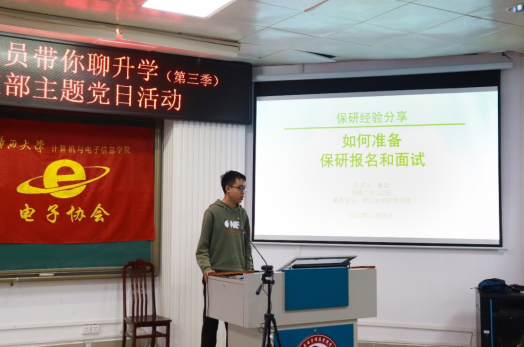 然后,由四位主讲人一一分享经验。第一位分享经验的主讲人是以专业排名第二成功保研至浙江大学电子信息硕士专业学位研究生的网络工程192班姜岩同志。姜岩同志结合自身经验详细介绍了如何获得保研资格及如何准备保研报名和面试,分析了各项面试的形式流程与应对措施。姜岩同志建议同学们要对自己有信心、相信自己、怀揣希望、学会选择。
