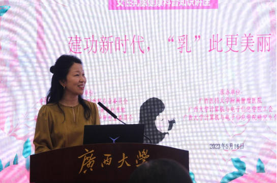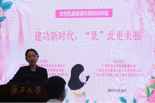 然后,广西医科大学附属肿瘤医院乳腺外科姬逸男副主任为大家做了《重塑“乳”初 逐梦未来——关于乳腺癌治疗的那些事儿》的主题报告。她在报告中指出,现在女性乳腺癌发病率相当高,女性应该做好定期检查。同时,姬副主任通过数据和图片对比,向大家展示了乳腺切除术后的效果,并介绍了乳房再造术的应用和治疗范围,以及进行肿瘤治疗后的复查和随访措施。