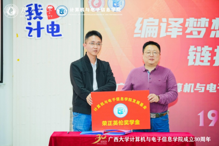 最后是“荣正英伦奖学金”签约仪式,2004级电子信息工程专业校友、广西英伦信息技术股份有限公司监事会主席赖俊全同志和jdb电子游戏官方网站张振荣常务副院长,分别代表公司与学院签约。