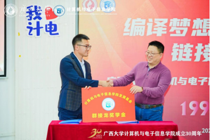 接着进行“群接龙奖学金”签约仪式,2008级计算机科学与技术专业校友、广西尚食科技有限公司项目经理王志明同志和jdb电子游戏官方网站张振荣常务副院长,分别代表公司与学院签约。