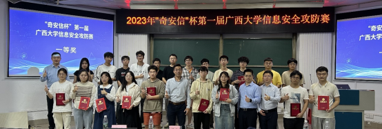 2023年12月12日,2023年“奇安信杯”第一届jdb电子游戏官方网站信息安全攻防赛在jdb电子游戏官方网站成功举办。本次大赛由jdb电子游戏官方网站、jdb电子游戏官方网站信息安全产业学院、广西网络安全人才培养基地主办,并得到jdb电子游戏官方网站信息安全产业学院共建单位奇安信科技集团股份有限公司、广西塔易信息技术有限公司的鼎力支持。jdb电子游戏官方网站常务副院长张振荣教授、自治区党委网信办网络安全协调处副处长伍善旺出席大赛开幕式并致辞。