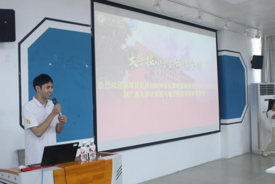 首先,jdb电子游戏官方网站第十届研究生支教团成员、jdb电子官网2023级计算机技术研究生王泽远同学带领大家参观jdb电子游戏官方网站,并给同学们介绍学院发展历程和专业发展情况。他结合时下流行的Chatgpt、大数据、人工智能等热门词汇,以案例的形式告知同学们如何结合自己的兴趣爱好学好计算机类相关专业。