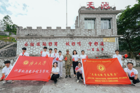 2024年7月16日上午,实践团来到了广西天池国防民兵哨所,在这里,实践团师生聆听了民兵代表讲述战士们在边境上坚守岗位、为国护边的感人事迹,深切感受到驻边战士为国奉献的崇高精神。“全国优秀共产党员”“最美奋斗者”凌尚前同志,从18岁坚守哨所直到退休,放弃镇里担任专职人民武装干部的机会,最终选择留在哨所。从青年守到白头,他说“选择了戍边,就执着坚守,只要我能守得动,就一直守下去。”像凌尚前这样的民兵不止一人,他们经受住了时间和环境的考验,扎根八桂大地,用自己的无私奉献守卫祖国边疆安宁。