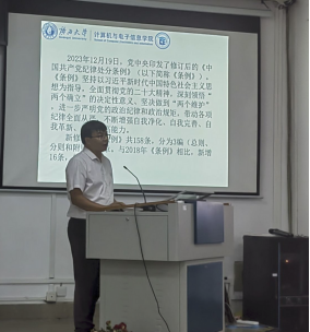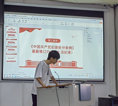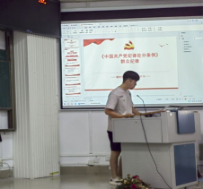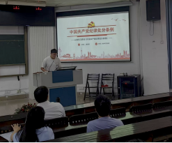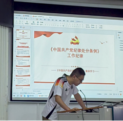 会议第四部分为研究生第一党支部书记邓珍琪同志讲授党课。邓珍琪同志为大家详细讲解了《中国共产党纪律处分条例》新修订的内容、基本内涵、重要意义,并从细节、日常行为角度讲述如何在实践中严守党的六大纪律。