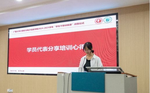 第三项,学院学生会办公室成员、计科241班陈璇同学代表全体学员分享培训心得。她提到,在此次培训中,学员们不仅收获知识和技能,更重要的是学会如何更好地服务同学、服务学院。她表示将会以更加饱满的热情和更加坚定的信念投入到今后的工作中。