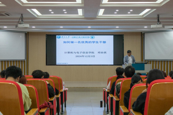 首先,邓珍琪老师以“如何做一名优秀的学生干部”为主题为全体学员授课。邓老师指出,学生干部担负着配合学院各方面力量教育和引导大学生,使其成为德智体美劳全面发展人才的职责,这是一项十分艰巨的任务,作为学生干部必须具备多方面的优良素质:一是思想政治素质、业务素质、心理素质和身体素质,学生干部要以身立教,为人楷模。二是组织管理能力、协调能力、表达能力等个人综合能力,学生干部应致力于能力素质的提升,确保各项工作任务出色、高效完成。三要正确处理工作和学习的关系,学生干部需具备统筹兼顾的能力,高效利用时间,实现学习与工作的和谐共进。四要正确看待学生干部的得失,担任学生干部要付出更多的时间与精力,但能得到更多的锻炼机会,这有利于提高自身的综合素质,增强责任心和社会责任感。五要严格要求自己,讲文明、知礼仪,以身作则,注意廉洁自律。