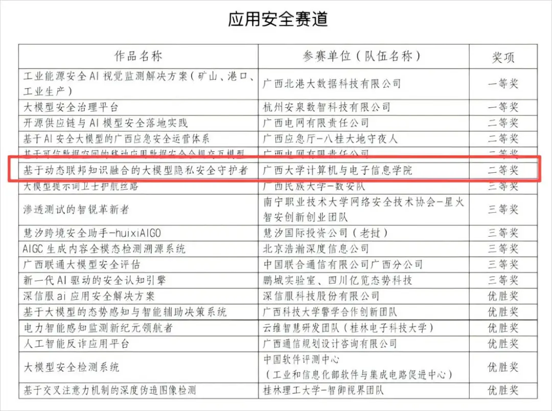 近日,由广西壮族自治区党委网信办、广西壮族自治区大数据发展局、南宁市人民政府联合主办的首届中国—东盟“护航丝路”人工智能安全大赛在南宁圆满落幕。jdb电子官网代表队凭借"基于动态联邦知识融合的大模型隐私安全守护者"项目,在应用安全赛道中脱颖而出,荣获二等奖。