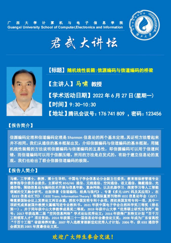 jdb电子游戏官方网站君武大讲坛:随机线性装箱: 信源编码与信道编码的桥梁