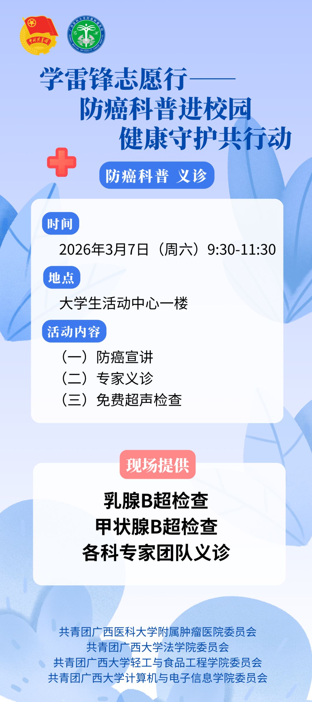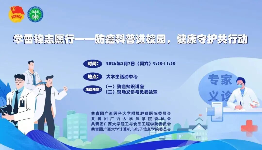 为进一步弘扬雷锋精神,提升大学生健康防护意识,普及癌症防治、食品安全、卫生法律及网络健康信息安全等知识,共青团jdb电子游戏官方网站轻工与食品工程学院委员会、共青团jdb电子游戏官方网站法学院委员会、共青团jdb电子游戏官方网站委员会,联合共青团广西医科大学附属肿瘤医院委员会,将于2026年3月7日开展“学雷锋 志愿行--防癌科普进校园,健康守护共行动”主题公益活动。