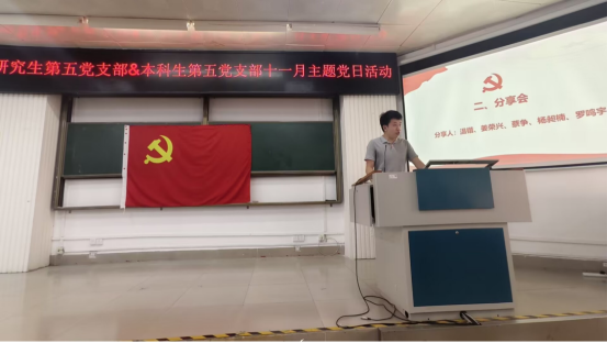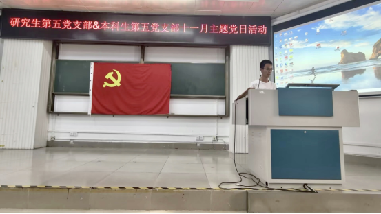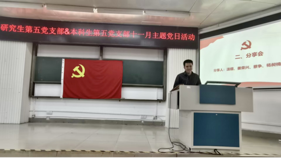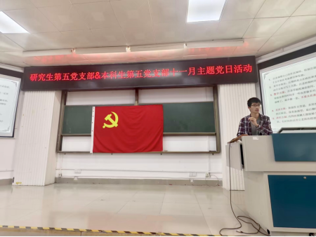 本次主题党日活动分为两个部分进行:一是学院党委专职组织员、本科生第五党支部书记薛金凤同志讲《加强党性修养,做合格的共产党员》专题党课;二是考研经验分享。