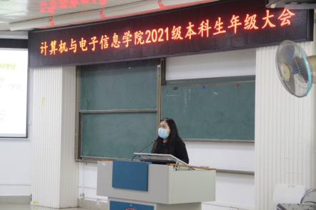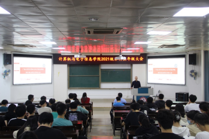 2023年4月11日下午,jdb电子游戏官方网站在学院214报告厅,组织召开2021级本科生年级大会。学院党委副书记邓珍琪老师、学院辅导员刘智斌老师、学院教学秘书甘瑜萍老师和罗程老师、计算机类专业213班班主任白琳老师、兼职辅导员路佳和李琳同志、以及2021级全体本科生参加会议。会议由刘智斌老师主持。