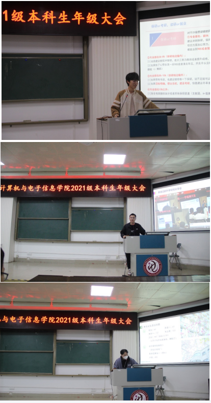 然后,2019级王志鹏、朱硕隆和李凯旋三位同学分别分享了个人学习工作、科研竞赛、保研考研等方面的经验,并给同学们提出一些意见建议。