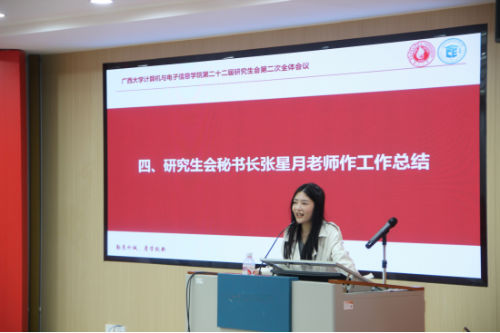 张星月老师对研究生会的工作进行总结,她首先肯定了研究生会上学期取得的成绩,并对今年研究生会的工作提出三点希望:一是加强学校-学院-班级三级联动,提升服务同学的精准度和实效性;二是立足时代前沿,发挥学科优势,结合人工智能专业开展特色精品活动;三是提高工作主动性,创新服务方式,精益求精,查漏补缺,切实提升同学们的参与感和获得感。