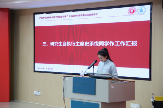 研究生会执行主席史承悦同学对上学期研究生会的工作开展情况进行总结,并对下一阶段研究生会的工作提出具体的设想和要求。