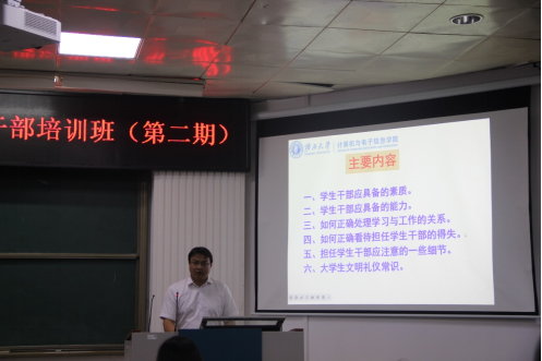 首先,邓珍琪老师以“学生干部应具备的素质和能力”为题给同学们做专题讲座。邓老师强调,学生干部应具有较高的政治素质、业务素质、心理素质、身体素质,也应具备一定的组织管理能力、协调能力、表达能力、创造力、交际能力。同时,邓老师为同学们讲解了如何正确处理学习与工作的关系、大学生文明礼仪常识等,他要求学生干部真正起到模范带头作用,讲礼貌、讲团结,学会感恩,遵守廉洁自律。