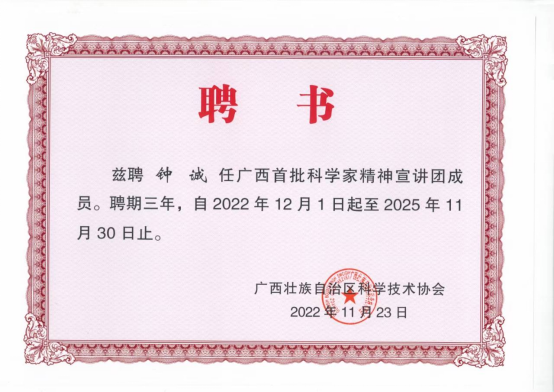 最近,广西壮族自治区科学技术协会颁发聘书,聘任jdb电子官网钟诚教授为广西首批科学家精神宣讲团成员,聘期三年。广西首批科学家精神宣讲团成员积极参加科学家精神宣讲工作,大力学习宣传贯彻习近平新时代中国特色社会主义思想、党的二十大精神,大力宣传新时代胸怀祖国、服务人民、勇攀高峰、敢为人先、追求真理、严谨治学、淡泊名利、潜心研究、集智攻关、团结协作、甘为人梯、奖掖后学的科学家精神。