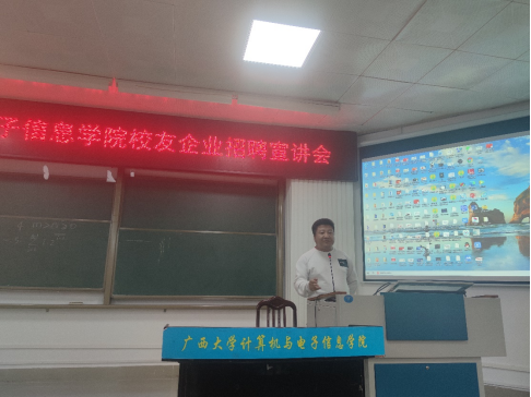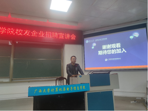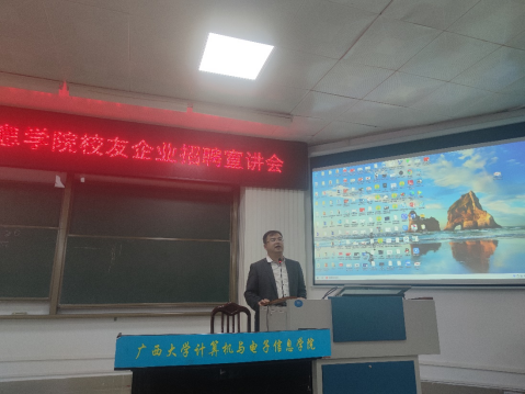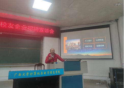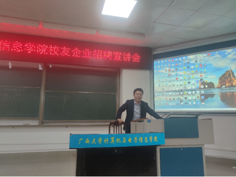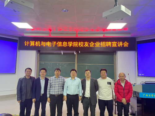 2021年12月16日下午,jdb电子游戏官方网站与校友企业合作,在学院214报告厅召开校友企业招聘宣讲会,校友企业广西尚信品科技有限公司、广西迅驰信息科技有限公司、广西优乐俊智能机器人有限公司和广西码农信息科技有限公司、以及广西天海信息科技有限公司等5家企业到学院开展2022届毕业生招聘宣讲。